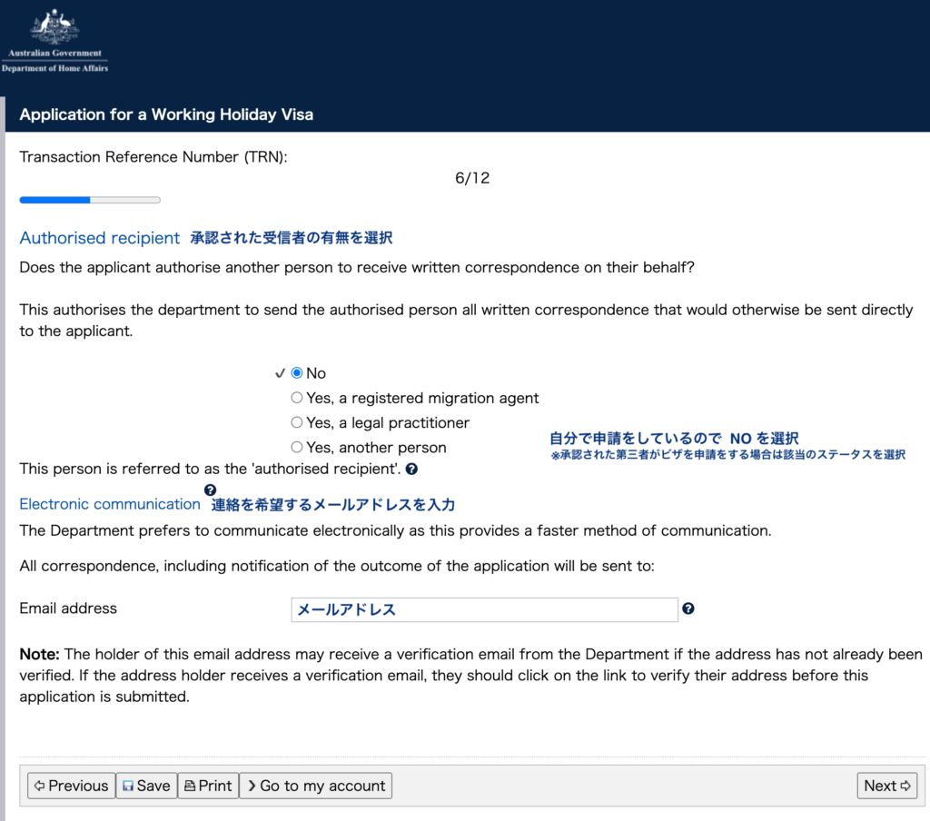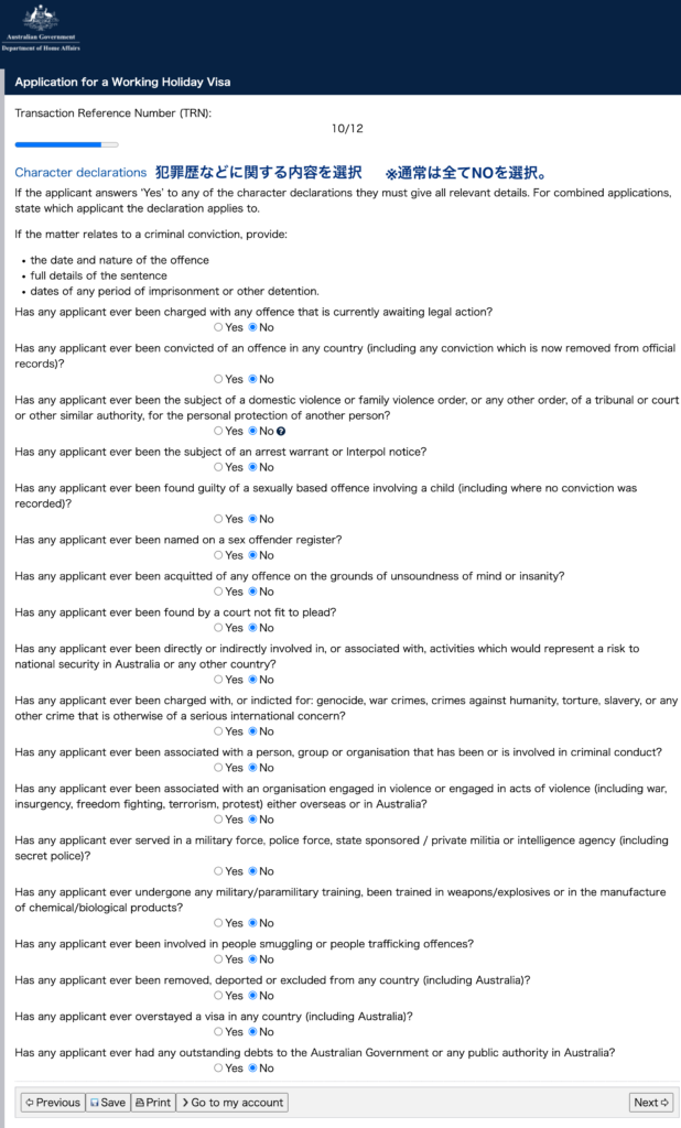 Noを選択 - 過去にWork and Holiday Visa(462)を取得したことがあるかかどうか